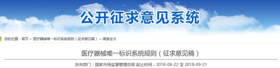 就在昨天(8月22日),國(guó)家市場(chǎng)總局發(fā)布《醫(yī)療器械**標(biāo)識(shí)系統(tǒng)規(guī)則(征求意見稿)》(以下簡(jiǎn)稱《征求意見稿》),明確此次征求意見時(shí)間為2018-08-22至2018-09-21,僅1個(gè)月的時(shí)間。