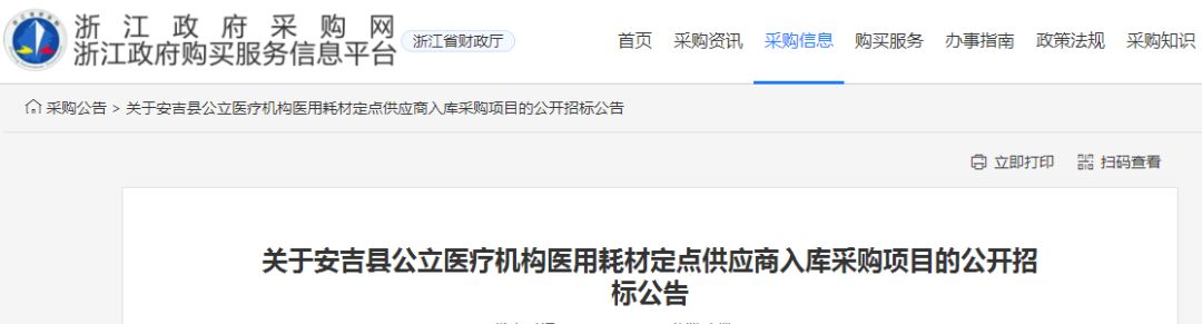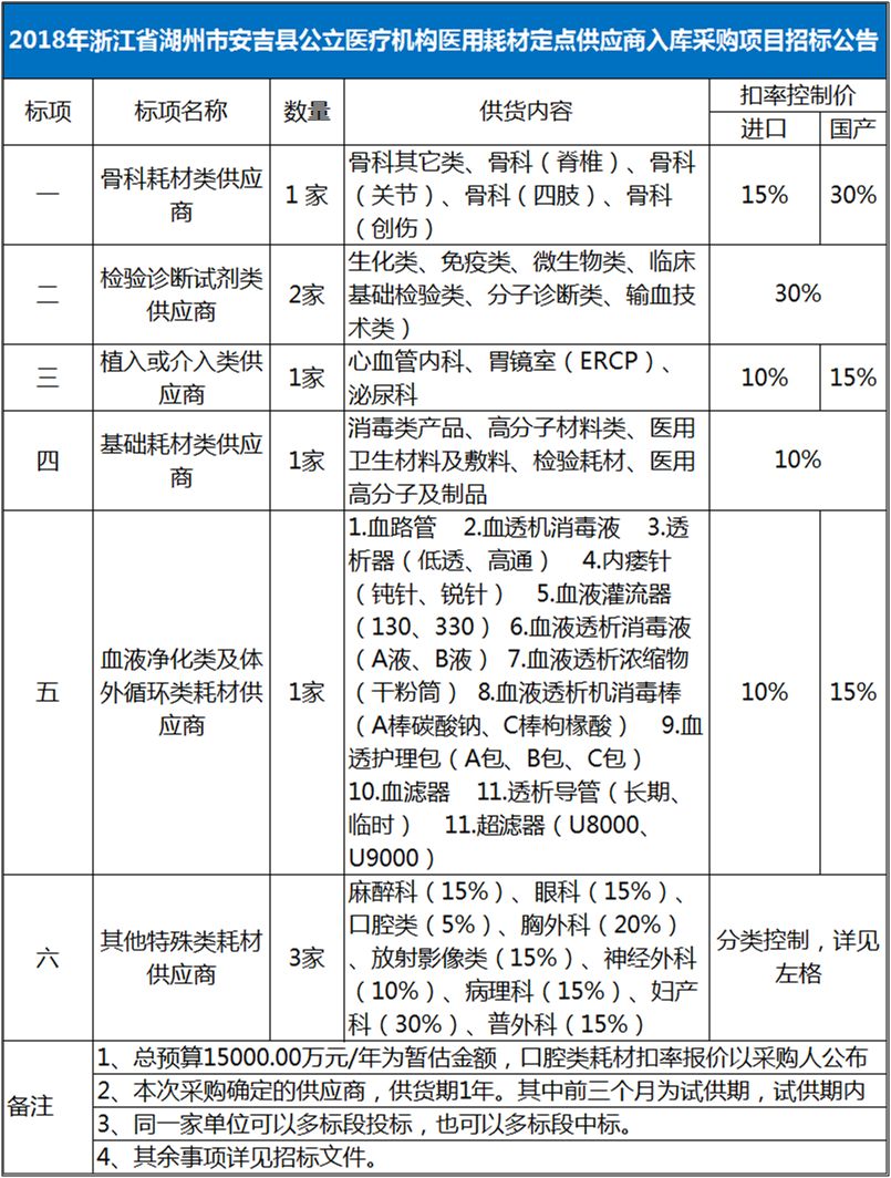 近日,浙江省湖州市安吉縣公立醫(yī)療機構(gòu)醫(yī)用耗材定點供應(yīng)商入庫采購項目公開招標,總預算1.5億元/年。