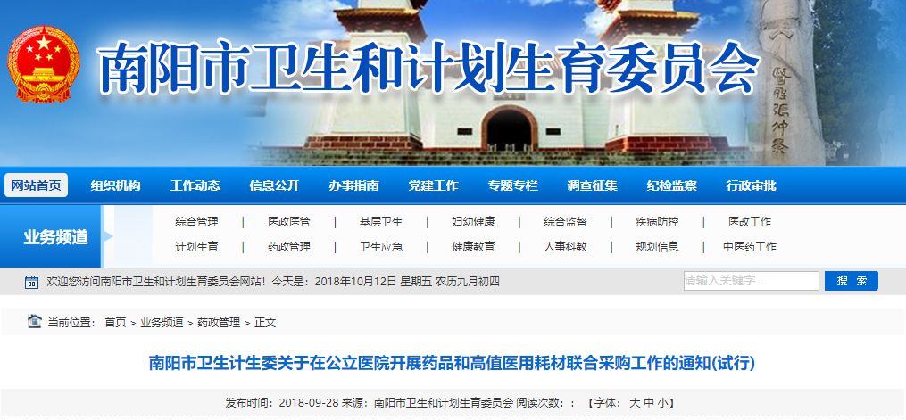 9月28日,河南省南陽市衛(wèi)計委發(fā)布了關于在公立醫(yī)院開展藥品和高值醫(yī)用耗材聯(lián)合采購工作的通知。