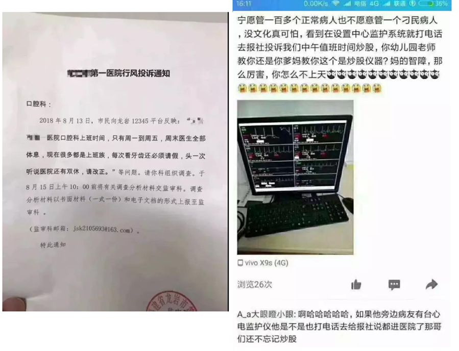 大家比較熟悉的投訴,包括:某醫(yī)院口腔科休雙休日被投訴的,還有看監(jiān)護(hù)儀被認(rèn)為上班炒股而被投訴的……結(jié)果,患者是上帝,上帝很生氣,后果很嚴(yán)重。
