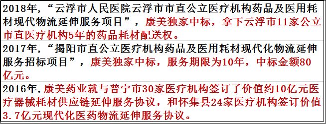 以康美藥業(yè)為例,2016-2018年之間,幾乎每年康美都拿下了廣東省SPD服務(wù)模式下,十幾家甚至幾十家醫(yī)院5-10年的耗材配送權(quán)。