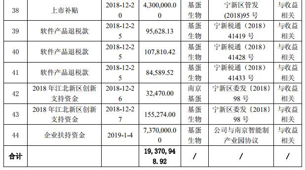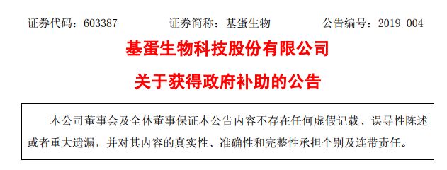 1月7日,基蛋生物發(fā)布了關(guān)于獲得政府補(bǔ)助的公告,公司及其下屬全資及控股子公司南京基蛋生物醫(yī)藥有限公司、吉林基蛋生物科技有限公司、長(zhǎng)春市布拉澤醫(yī)療科技有限公司、成都基蛋生物科技有限公司、河南基蛋生物科技有限公司于2018年1月1日至2019年1月4日累計(jì)收到各類政府補(bǔ)助總額為19,370,948.92元。