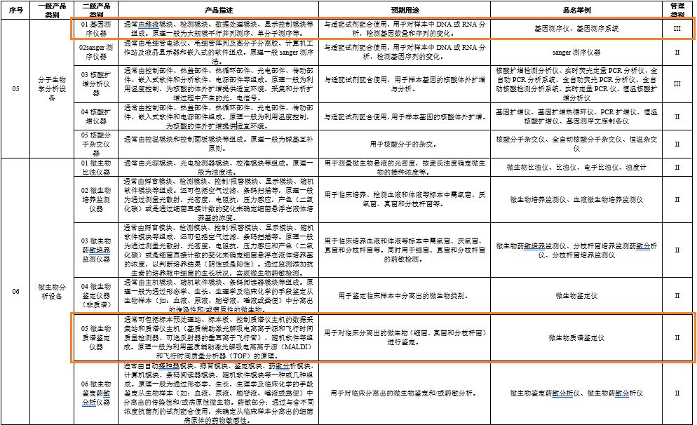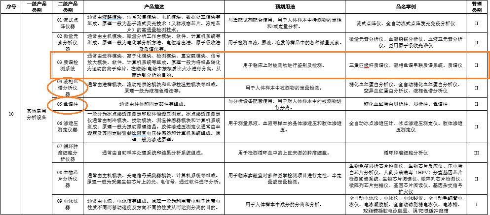 2017年8月31日國家食品藥品監(jiān)督管理總局發(fā)布了新版《醫(yī)療器械分類目錄》,并于2018年8月1日起正式施行。該分類目錄中有關(guān)臨床檢驗(yàn)器械說明的部分特別指出“根據(jù)學(xué)科發(fā)展和產(chǎn)品現(xiàn)狀,本子目錄的二級(jí)產(chǎn)品類別中新增加了如下內(nèi)容:基因測序儀、質(zhì)譜儀、生物安全柜和潔凈工作臺(tái)”。其中微生物質(zhì)譜鑒定儀器、質(zhì)譜檢測系統(tǒng)(如三重四極桿質(zhì)譜儀、液相色譜串聯(lián)質(zhì)譜系統(tǒng)、質(zhì)譜儀)、液相色譜分析儀器、色譜柱等在管理類別中均屬于第二類醫(yī)療器械(根據(jù)《醫(yī)療器械分類規(guī)則》中相關(guān)規(guī)定,醫(yī)療器械按照風(fēng)險(xiǎn)程度由低到高,管理類別依次分為**類、第二類和第三類)。