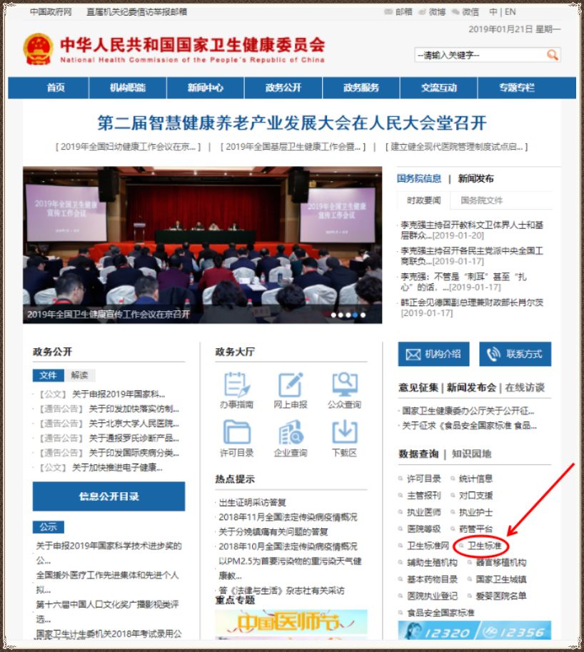1.打開中華人民共和國國家衛(wèi)生健康委員會官網(wǎng),在主頁數(shù)據(jù)查詢下面找到衛(wèi)生標準。