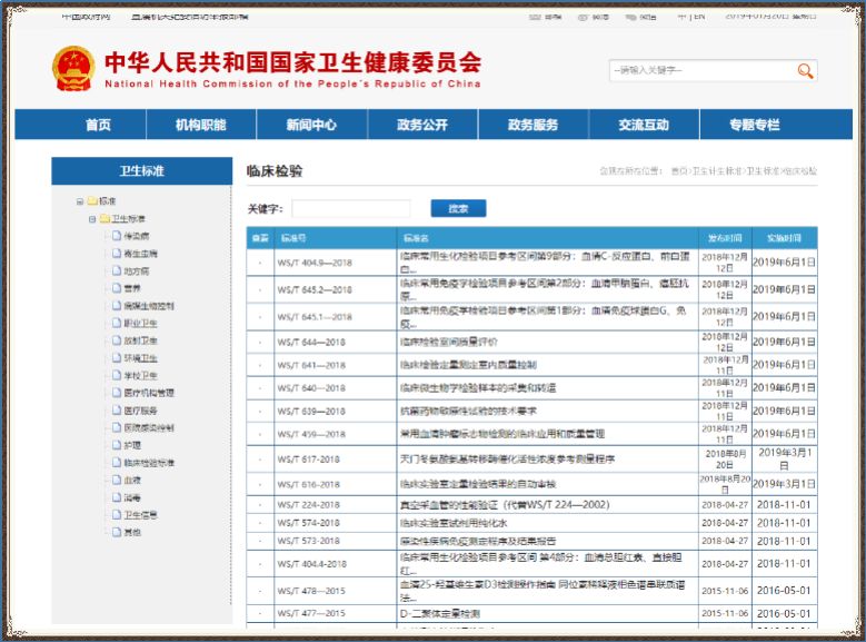 隨著2019年初國家衛(wèi)健委**新發(fā)布了關于臨床檢驗的衛(wèi)生行業(yè)標準。目前臨床檢驗衛(wèi)生標準目錄有118條,您工作需要用時是否不知如何查找,今天小編來為大家分分類。