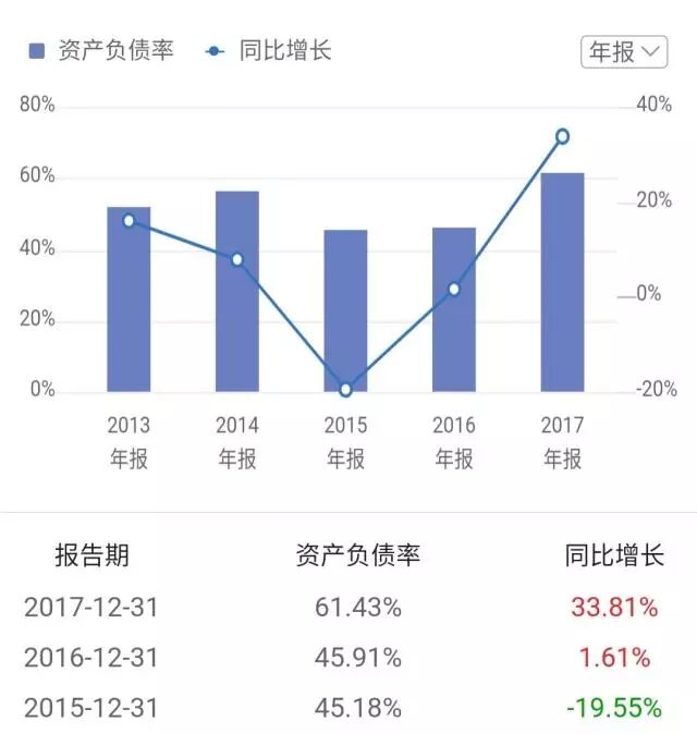 而持續(xù)不斷的并購于上市公司而言,可謂是雙刃劍。業(yè)績增長的同時,潤達(dá)醫(yī)療也面臨著資產(chǎn)負(fù)債率暴增的風(fēng)險。數(shù)據(jù)顯示,潤達(dá)醫(yī)療的資產(chǎn)負(fù)債率在2015年年末為45.18%,經(jīng)過三年的時間,現(xiàn)已攀升至2017年年末的61.43%,其2017年的漲幅更是超過三成。